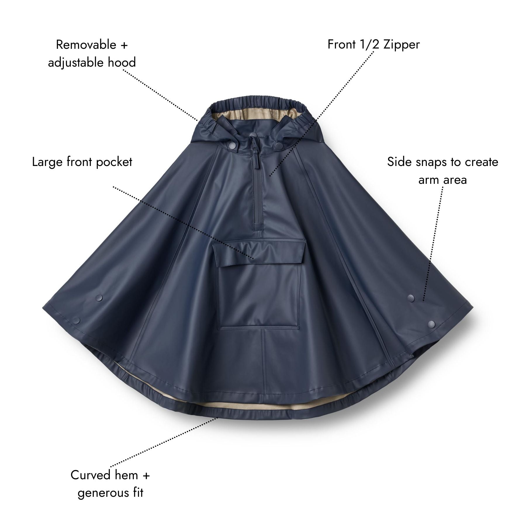 Get your kids ready for some rainy day fun with Raincape Drops! This playful rain cape is perfect for jumping in puddles. Pair it with Wheat rain pants or overalls for even more adventure (and mud)!