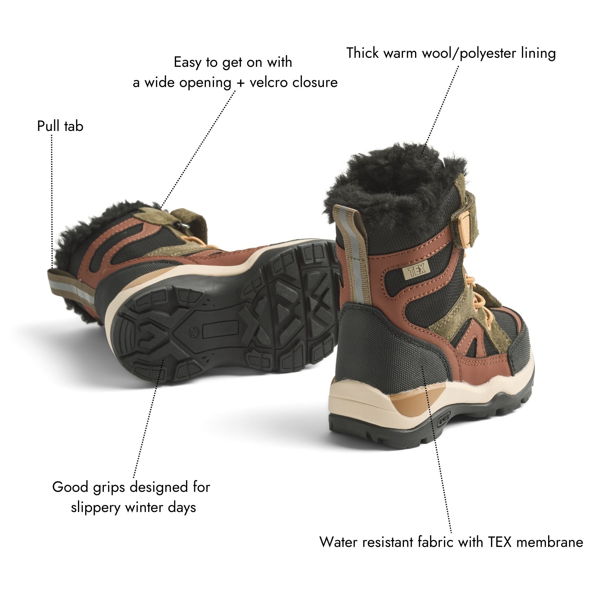 • These winter boots are lined with wool/cotton fleece and a waterproof tex membrane that makes the boots warm and waterproof